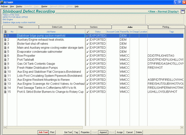 REFMAN also allows ship's staff to 'tag' jobs as being of a particular type or as having particular requirements. Using these 'tag codes' it is very easy for ship's staff to produce a work list for use in a stand-down period or when there is a total shutdown planned.
