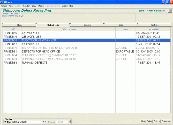 REFMAN allows you to create any number of defect lists. Lists can be 'exportable', that is to say that the defects they contain can be transferred to the Superintendent or Port Engineer, or they can be 'non-exportable' which means that they can be used as 'private' or 'departmental' onboard work lists for ship's staff.
