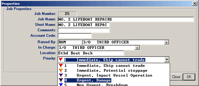 Jobs in 'private' work lists can start out as 'one-line' items which are simply deleted as they are completed. Those that can not be completed by ship's staff can later be expanded into a full defect description before being assigned to the 'exportable' list ready for transferring to the Superintendent or Port Engineer and eventually included as a job in a specification.