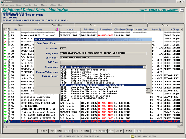 For Defects that can be dealt without waiting for a drydocking, the Superintendent sets a user-defined status along with a planned date to indicate how and when it is to be dealt with. For example it might be 'Assigned to a contractor', 'Office to arrange visit by Manufacturers Representative', 'Ships staff to rectify' or 'Rejected'!