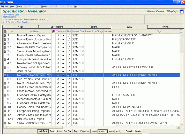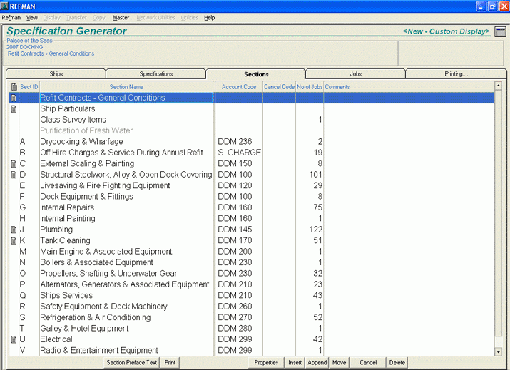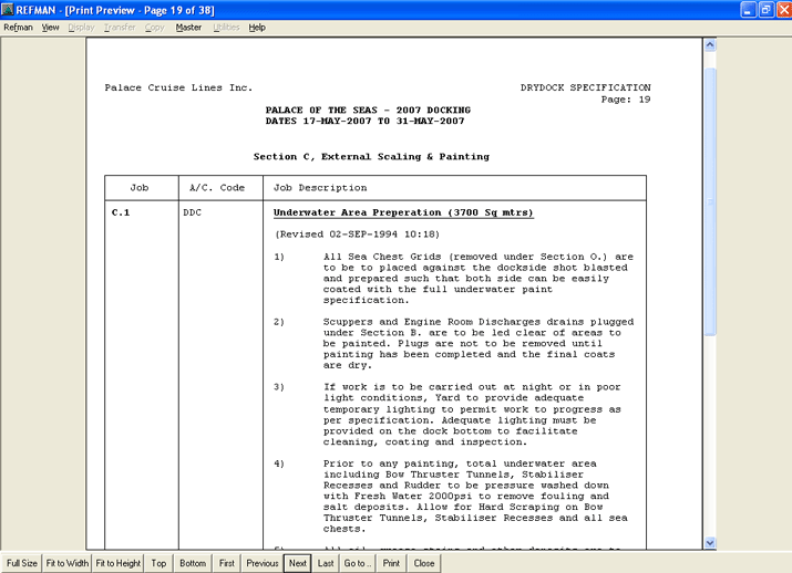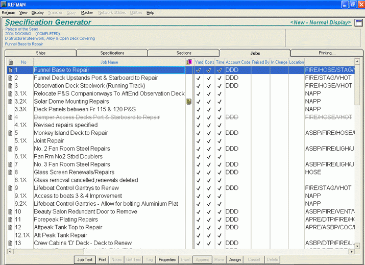 Provides the Superintendent or Port Engineer with facilities to create refit or drydock specifications, copy and store specifications, add, amend, delete and cancel jobs, move jobs from one specification to another, print specifications and incorporate defect reports which have been transferred from REFMAN's Shipboard Defect Recording module.