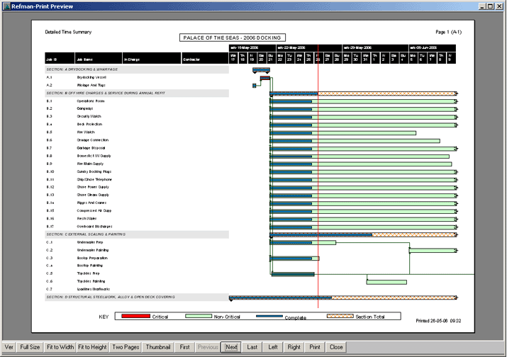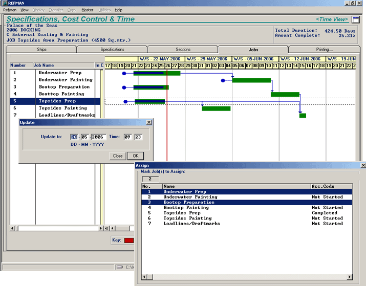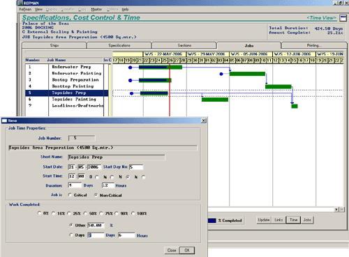 To achieve this, REFMANs Time Management module provides the means for the shipyard themselves to supply the owner with estimated start dates and durations for each job as part of the yards original bid. Times and durations can then be added for any owners jobs which are to be carried out by sub-contractors or other specialists. Using this information, REFMANs Time Management module can produce a simple time line (Gantt) chart that gives a pictorial representation of when each job is expected to start, how long it should take and when it should be finished.